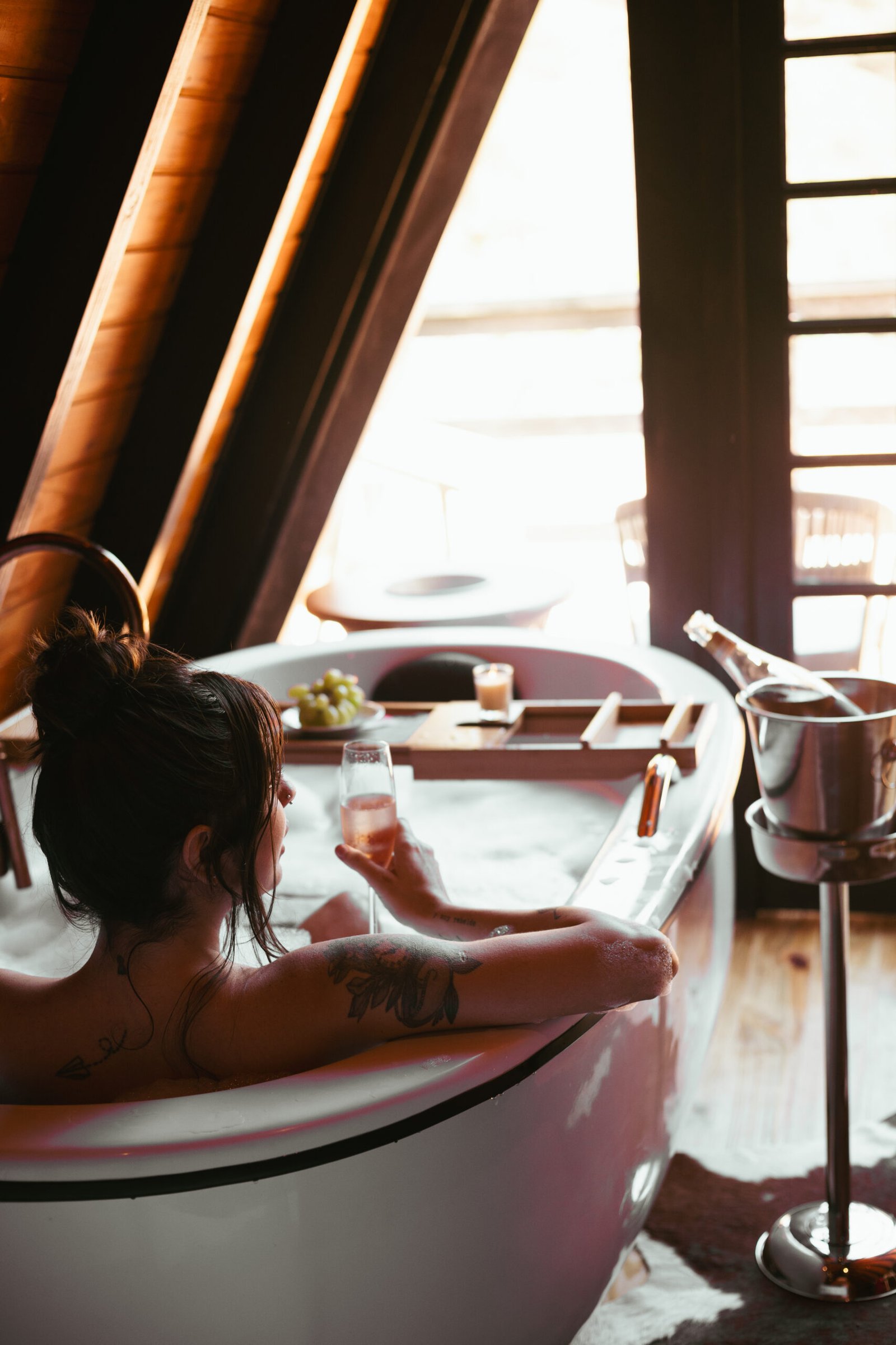 Banheira, vinho, aromas e toques pensados para o prazer do casal.